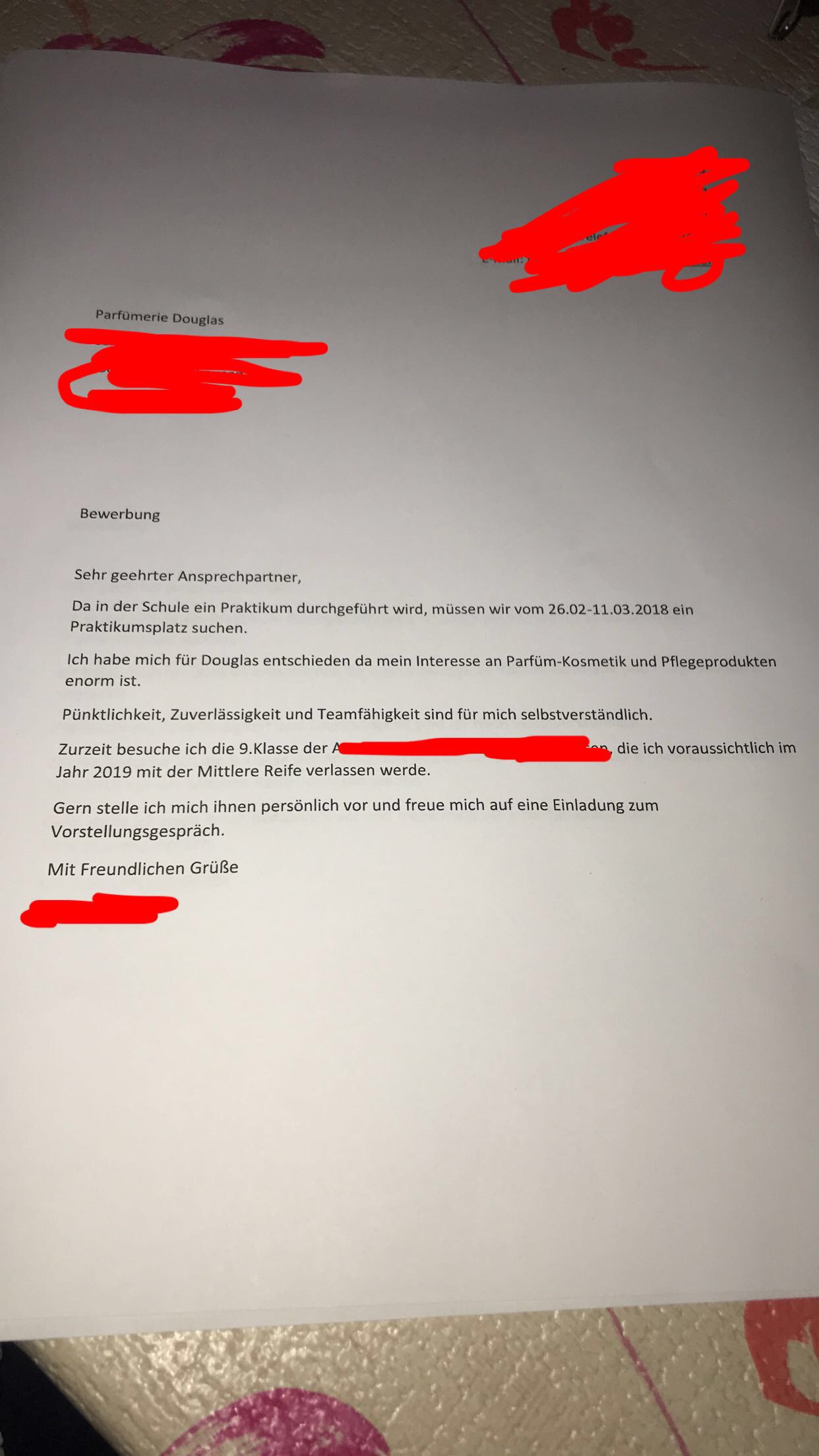 Hier mein text Bewerbung um einen Ausbildungsplatz als Kauffrau im Einzelhandel. Also ich hab vor 12 Wochen eine Bewerbung an Douglas verschickt,aber leider habe ich bei meinem Anschreiben keine Adresse von der DouglasFiliale hingeschrieben,weil ich mir nicht sicher war welche Filiale gemeint war Also bei der Stellenanzeige stand nur die Stadt,aber es gibt 2. Also, ich möchte am bis zum mein Praktikum in Douglas machen, und benötige dabei hilfe bei meiner Bewerbung / Bewerbung um ein Praktikumsplatz im Parfumerie Douglas Sehr geehrte Damen und Herren, ich möchte gerne mein dreiwöchiges Schülerbetriebspranktikum vom – in Ihrer Parfümerie absolvieren.