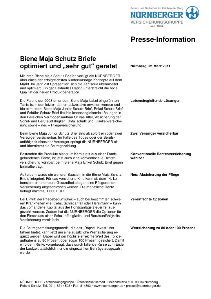 Ein Produkt der Nürnberger Versicherungsgruppe Biene Maja Junior Schutz Brief 8,7 % Rendite nach Steuern (40 % Steuersatz) monatlich 50 EUR Summe aller Einzahlungen = EUR Auszahlung mit 40fachem Gewinn!. Biene Maja Patenschaft Flex Nürnberger Versicherung Kindern einen eigenständigen Start ins Leben zu bieten, für eine gute Ausbildung oder die erste eigene Wohnung vorzusorgen, das möchten wohl alle Eltern, Großeltern oder Paten. Biene Maja Schüler Schutz Brief Produktsteckbrief Biene Maja Schüler Schutz Brief bei Ablauf als Auszahlung, Anteilsscheine oder Umwandlung in lebenslange Altersrente LV007_703_1907 txts NÜRNBERGER Versicherung Produktsteckbrief Tarif IBU3110S Seite 2 von 2 Biene Maja Schüler Schutz Brief.