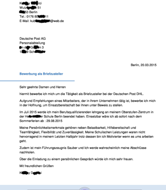 Ehem befristeter Mitarbeiter Briefzusteller Glassdoor bietet 1 9 Deutsche Post & DHLBewertungen, anonym von Deutsche Post & DHLMitarbeitern gepostet Lesen Sie die Mitarbeiterbewertungen auf Glassdoor, um zu entscheiden, ob Deutsche Post & DHL für Sie das richtige Unternmehmen ist. In der Einleitung sagst du, dass eine Tätigkeit ausgeschrieben wurde Daraus ergibt sich, dass es sich um keine Initiativbewerbung handelt Die Stellenanzeige trägst du damit in deinen Betreff ein (zweite Zeile). Deutsche Post AG Briefzusteller für einen 0 Kommentare;.