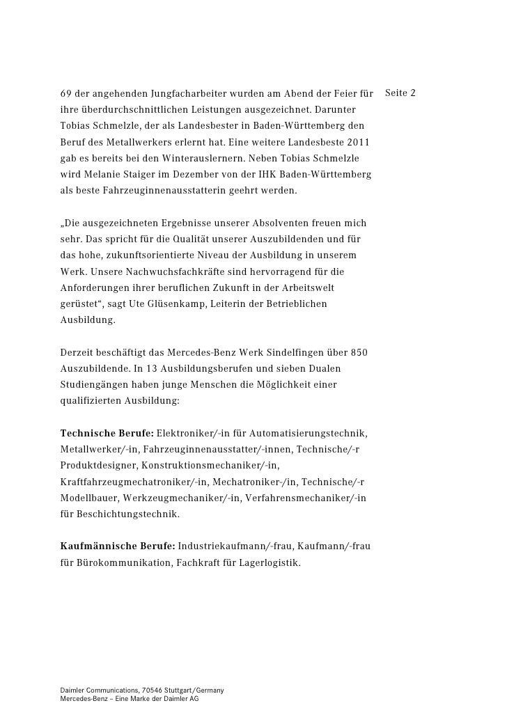 Dann könnte die Ausbildung zur Industriekauffrau / zum Industriekaufmann bei medi das Richtige für dich sein Als Industriekauffrau / Industriekaufmann eignest du dir ein breites Wissen an Dieses wendest du direkt in den Bereichen Material und Produktionswirtschaft, Marketing und Vertrieb sowie im Personal, Finanz und Rechnungswesen an. Jeder kennt sie, die Automobile mit dem Stern und jeder weiß, dass diese Wagen Qualität bedeuten Vor über hundert Jahren begann die Firmengeschichte der Daimler AG, die vor allem dank ihrer bekanntesten Marke MercedesBenz heute weltweit zu den erfolgreichsten Unternehmen in der Automobilbranche gehört Mehr als Mitarbeiter sind bei der Daimler AG beschäftigt und der Umsatz im. Ähnlich wie bei der Dritten Seite bietet dir das Motivationsschreiben aber die Möglichkeit, deinen potentiellen Ausbildungsbetrieb von dir und deinen Fähigkeiten zu überzeugen oder zu erklären, warum du deine Ausbildung gerne in dem jeweiligen.