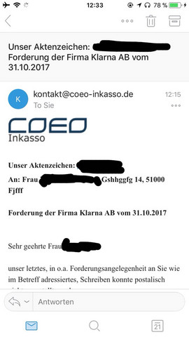 Klarna klarna sending me threatening letters from the debt collection agency called coeo inkasso gmbh;. Hallo, inkasso Coeo und Klarna?. Hallo habe vor kurzem was bei Wish bestellt wollte danach mit dem Überweisungsschein von Klarna zahlen meine Bank hat diesen jedoch nicht angenommen zusatzlich kamm dann die zweite Mahnung wo ich das leider dann vergessen hab bgis zur frist zu zahle.