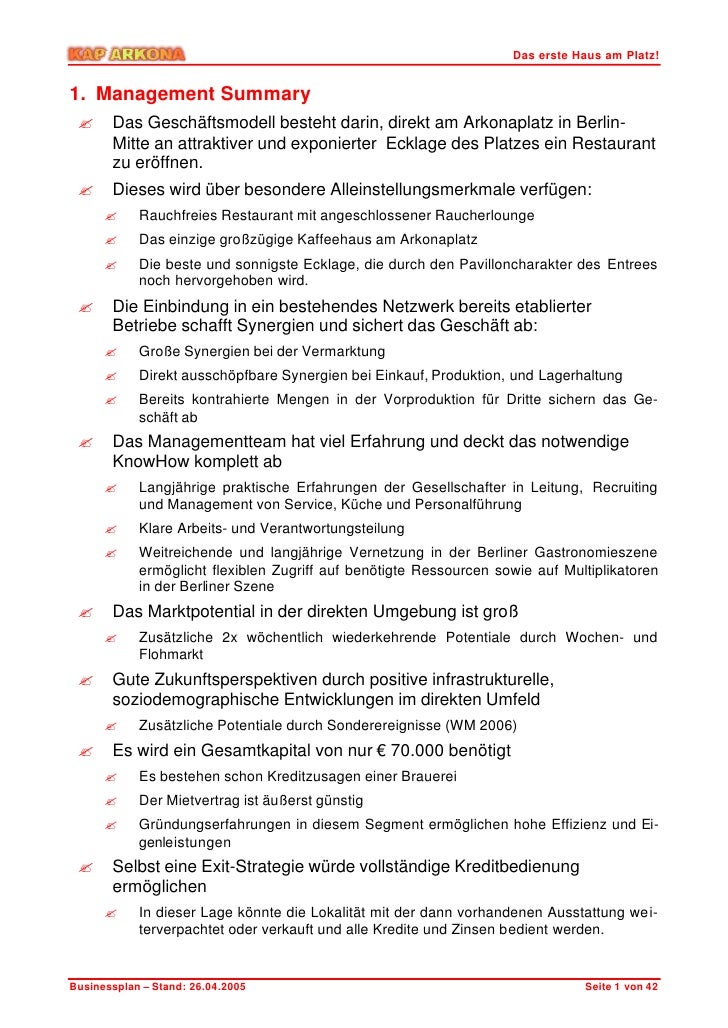 81 80 info@projektgastde. Café eröffnen ohne Erfahrung und Ausbildung Warum das theoretisch geht, in der Praxis aber oft den Bach runter geht Je mehr Praxiserfahrung du in deiner Erfahrungsbilanz im Businessplan nachweist, desto eher ist die Bank davon überzeugt, dass du das Ganze wirklich willst und es ernst meinst Die Bank will die grösstmögliche Sicherheit. Businessplan Den Traum in die Realität umsetzen Ein Businessplan hilft Ihnen Ihren Traum in die Realität umzusetzen Wenn Sie Förderungs oder Investitionsmöglichkeiten wahrnehmen möchten, kommen Sie um einen Businessplan nicht herum Jedoch auch für Sie persönlich ist ein Businessplan von großem Vorteil.